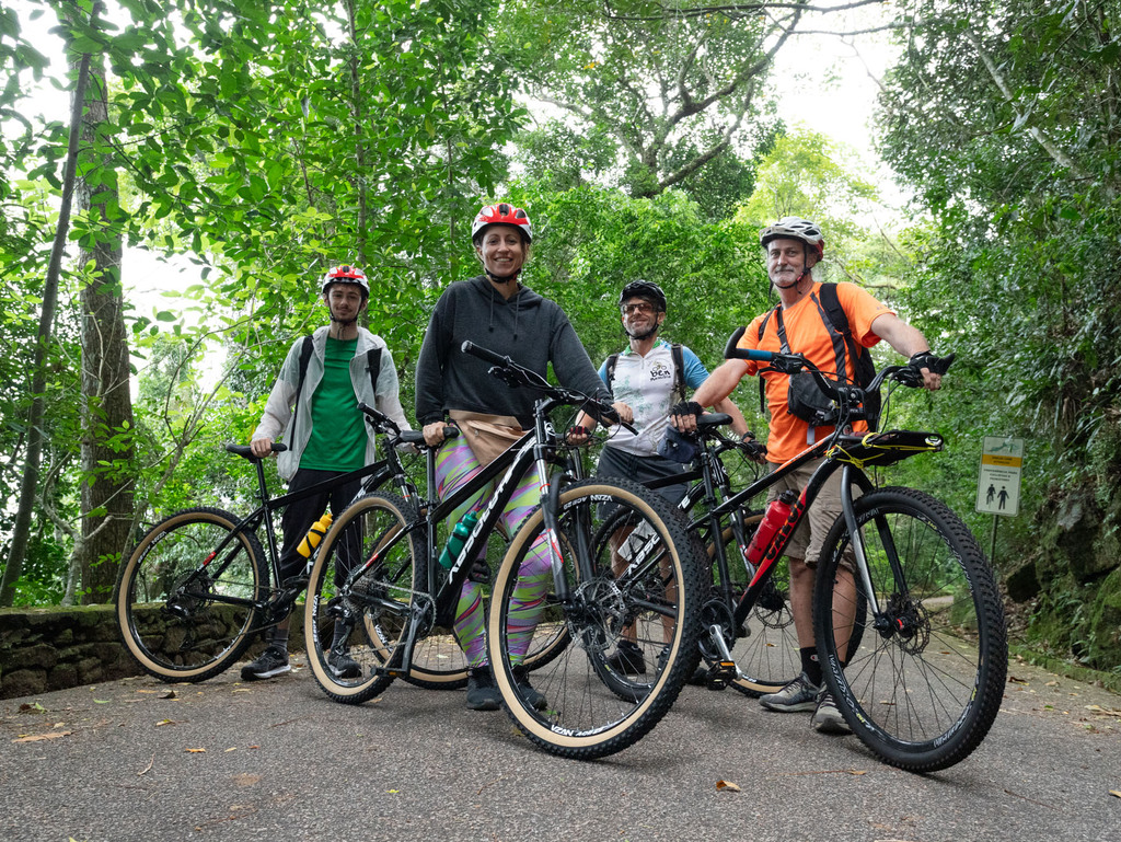 Oferecemos bicicletas de mountain bike aro 29 com quadro de alumínio, suspensão dianteira, freios a disco hidráulicos e ampla variedade de marchas para encarar as subidas do passeio pela floresta. Nossas bikes são equipadas com componentes de qualidade e mantidas com alto padrão de manutenção. Também fornecemos capacetes para todos os passeios.