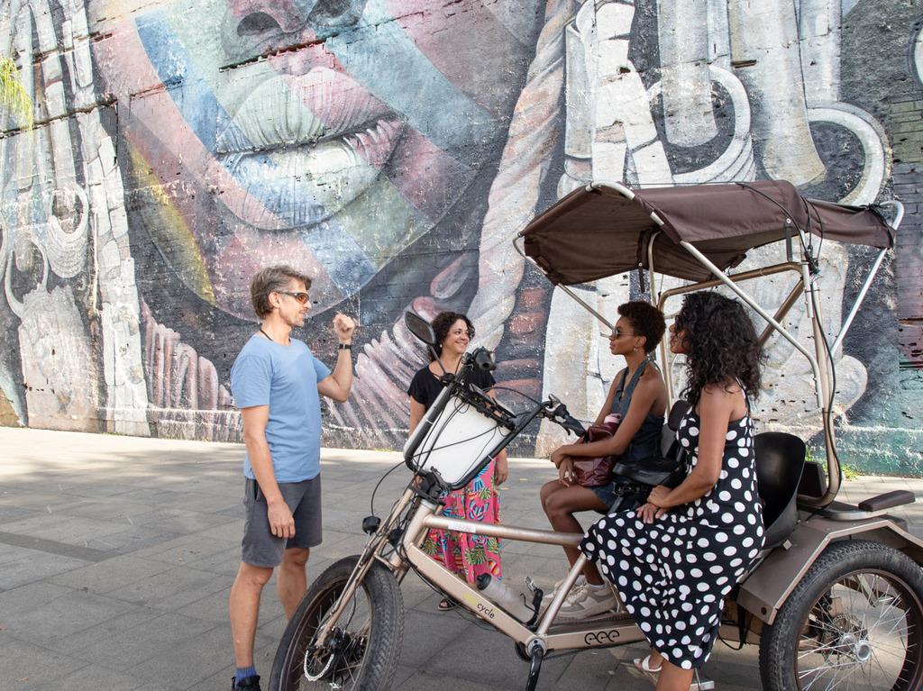 Nossos bicitáxis são triciclos com assistência elétrica movidos a pedal, capazes de transportar 4 passageiros, além do condutor/guia. Atualmente, limitamos os grupos a dois bicitáxis por passeio, totalizando até 8 visitantes. Os bicitáxis têm velocidade limitada a 20 km/h, freios a disco hidráulicos, cintos de segurança para os passageiros e um painel solar para recarregar as baterias.